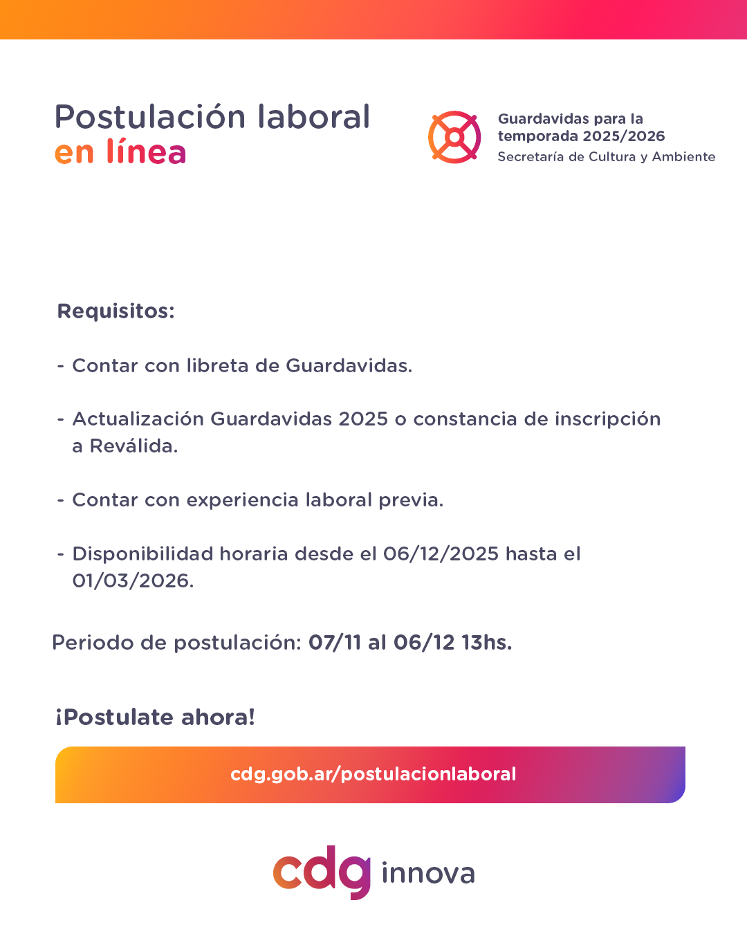 El Municipio de Cañada de Gómez informa que se encuentra abierta la convocatoria para guardavidas que prestarán servicio en los natatorios municipales durante la próxima temporada de verano, comprendida entre el 6 de diciembre y el 1 de marzo del…