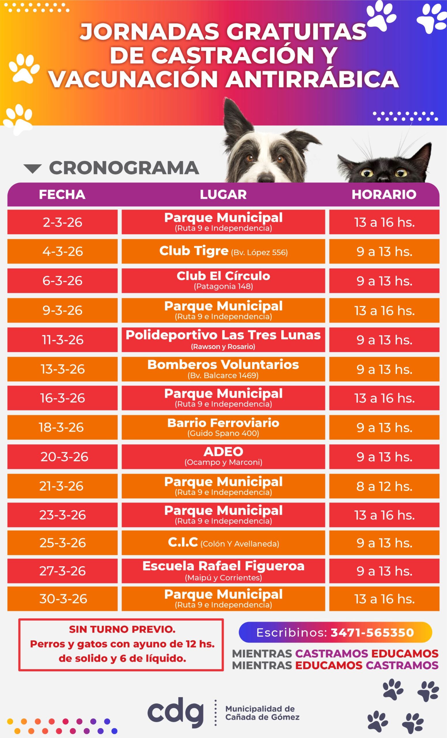 La Municipalidad de Cañada de Gómez informa el cronograma de castraciones, vacunación antirrábica y atención veterinaria primaria para el mes de marzo, como parte del Programa de Equilibrio Poblacional que lleva adelante el Área de Salud Animal: Lunes 02/03 Parque…