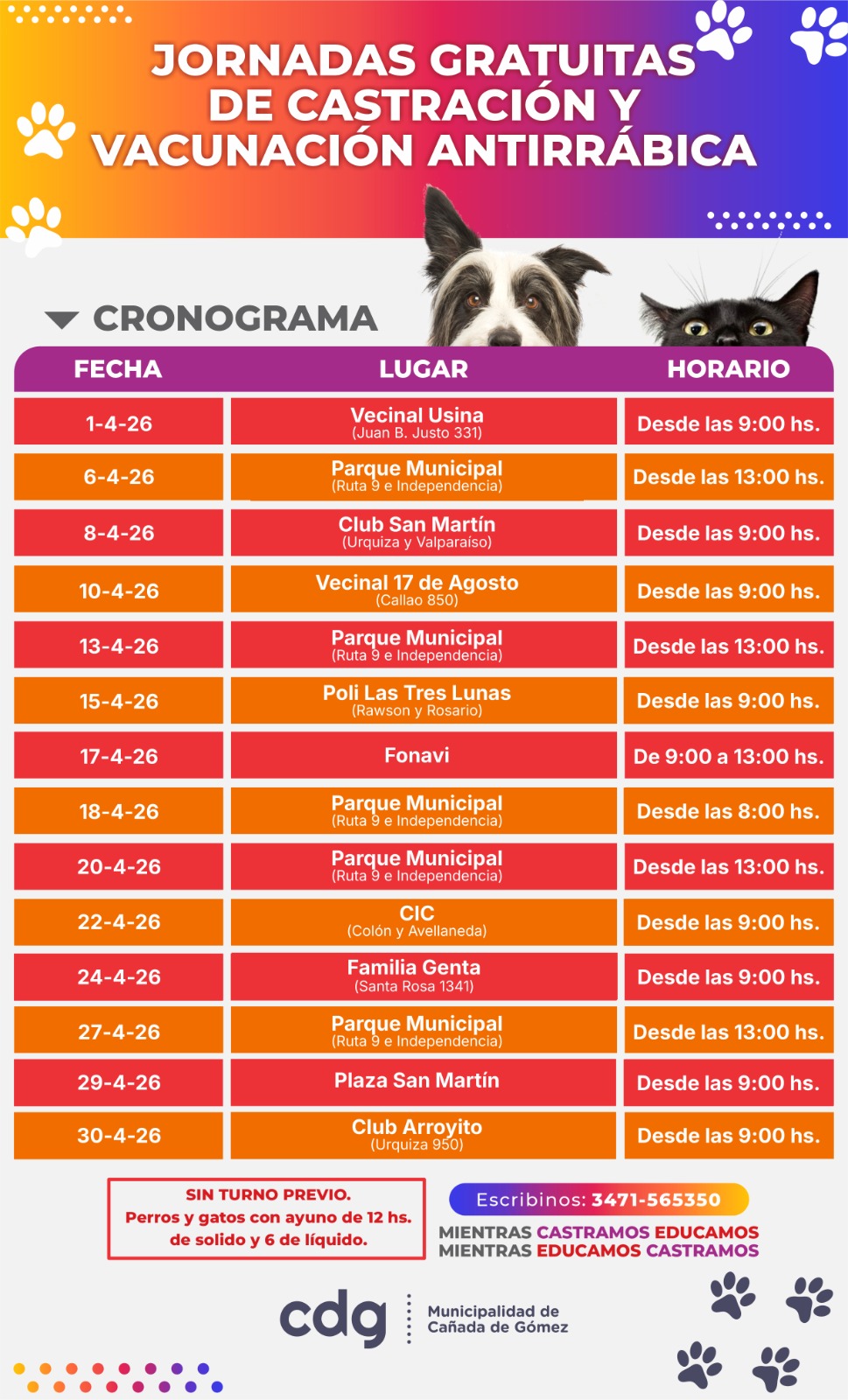 La Municipalidad de Cañada de Gómez informa el cronograma de castraciones, vacunación antirrábica y atención veterinaria primaria para el mes de abril, como parte del Programa de Equilibrio Poblacional que lleva adelante el Área de Salud Animal: Lunes 6/4 Parque…