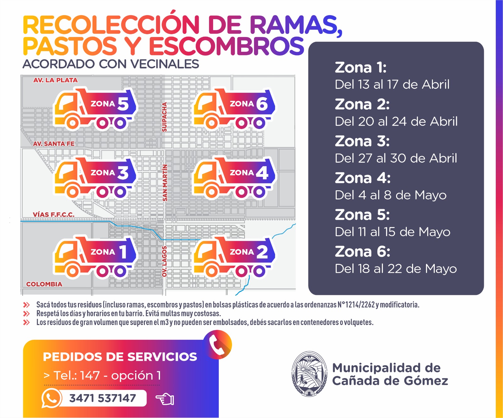 La Municipalidad de Cañada de Gómez informa el cronograma de recolección de ramas, pastos y escombros para las próximas semanas: Zona 1 (entre Colombia y Vías F.F.C.C., Ov. Lagos al oeste): del 13 al 17 de abril. Zona 2 (Colombia…
