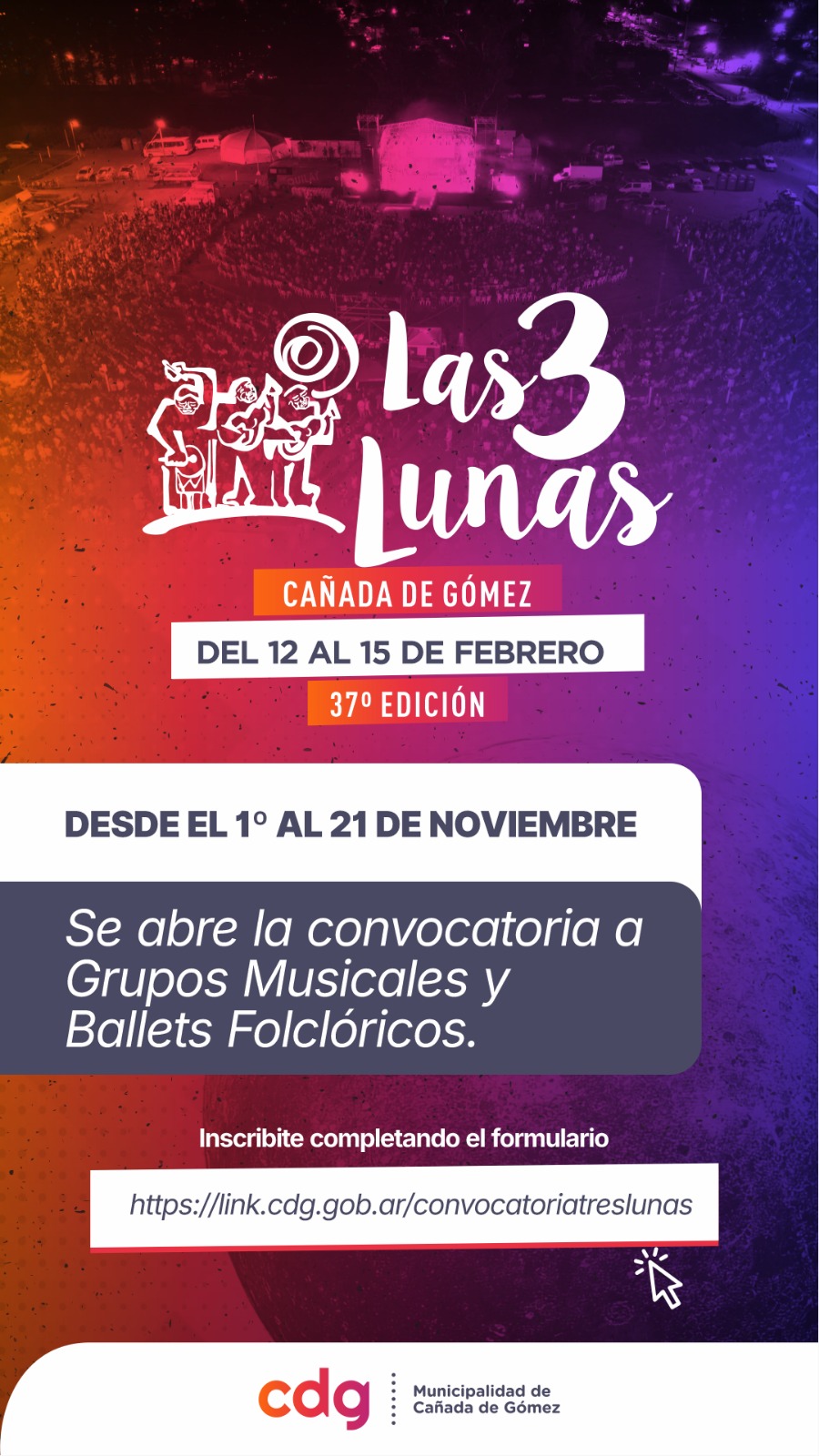 La Municipalidad de Cañada de Gómez, a través de la Secretaría de Cultura, anuncia la apertura de las convocatorias para participar del 37° Festival de las Tres Lunas que se realizará del 12 al 15 de febrero de 2026, uno…