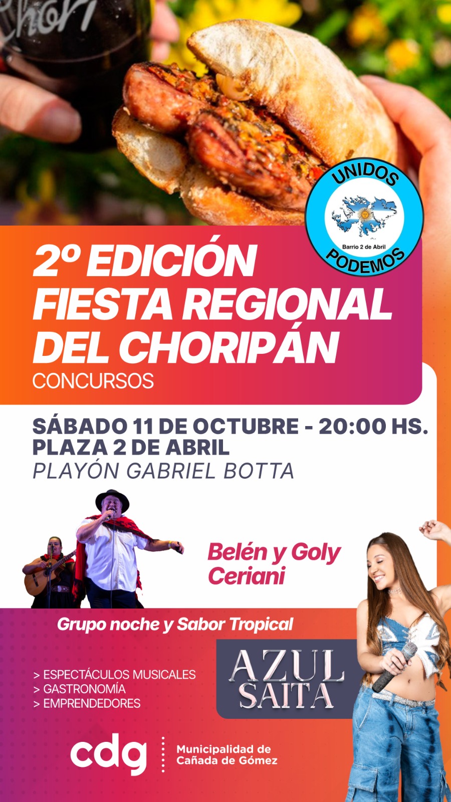 La Municipalidad de Cañada de Gómez junto a la Vecinal 2 de abril invitan a la comunidad a participar de la 2º Edición de la Fiesta Regional del Chopirán, que se realizará el sábado 11 de octubre a las 20…
